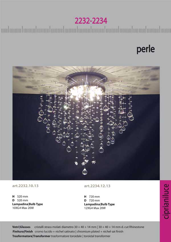 Un’esplosione di mille gocce di cristalli molati. Sospesi da sottili e resistenti cavi di nylon, gli strass sembrano librarsi in volo, quasi a fluttuare nell’aria leggeri e scintillanti. Per ogni articolo misure differenti per abbracciare le esigenze di tutti gli ambienti, dallo stretto corridoio alla grande sala, alla cucina in stile. La luce morbida in bassissima tensione oppure il portalampada G9 in basso consumo energetico rendono l’intera collezione una soluzione adeguata all’esigenza di arredare lo spazio con stile con un occhio all’efficienza. Particolari in fusione di ottone finemente cromato, portalampada in ceramica dalle prestazioni superiori, trasformatori toroidali o elettronici ad alta modulabilità.