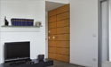 Una controparete in legno contraddistingue la zona di ingresso dell'appartamento. E' costituita da pannellature rivestite in radica di madrona e fughe in palissandro ; è stata realizzata su disegno.